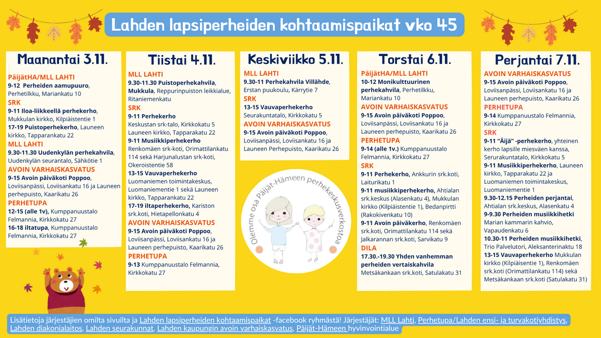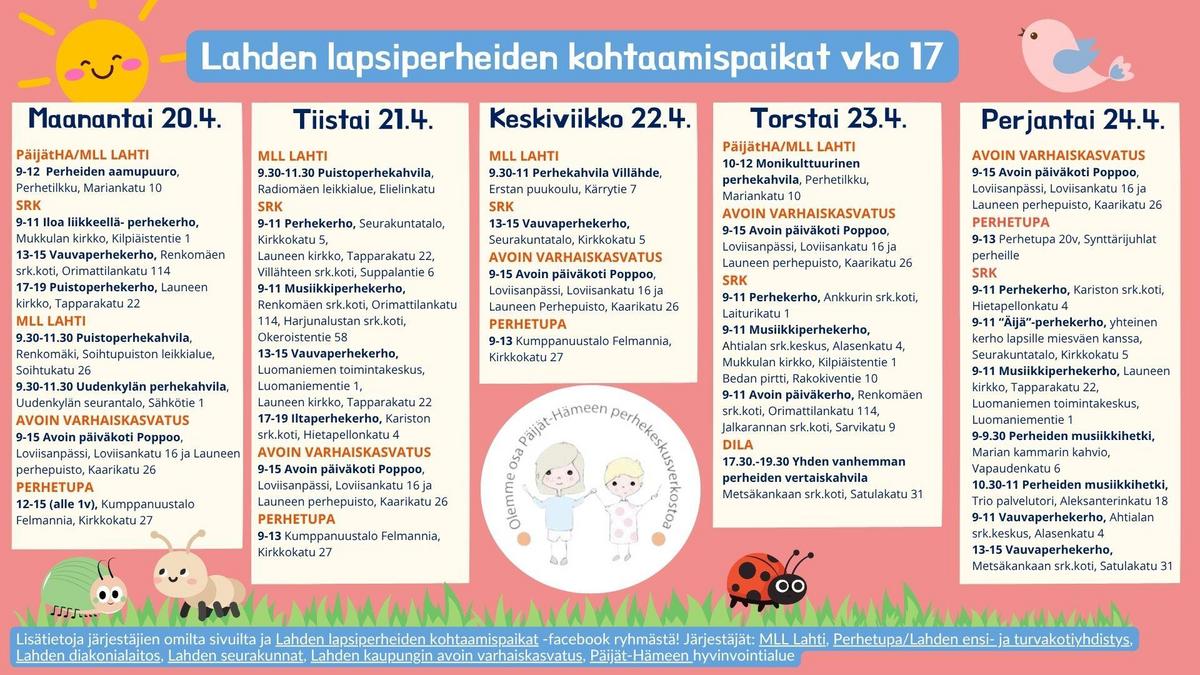 Lahden lapsiperheiden kohtaamispaikkaverkosto kokoaa kaikki avoimet kohtaamispaikat yhteiseen viikkokalenteriin. Kalenteri löytyy myös verkoston Facebook sivuilta.