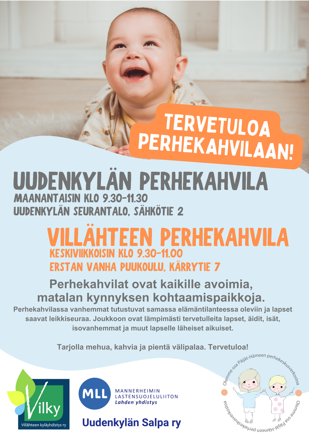 Villähteen perhekahvila avoinna keskiviikkoisin klo 9.30-11.00 Erstan puukoululla, Kärrytie 7, Villähde. HUOM! Autoparkki vain Erstan koulun pihalla, ajo vain Kärrytien kautta.